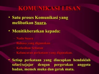 Cara-cara seseorang berkomunikasi dengan berkesan. Kecuali kamu berbicara dengan pasangan tentang apa yang dirimu rasakan atau pikirkan hubunganmu tidak akan bertahan dalam ujian waktu dan kamu berdua mungkin terdiam. Pilihlah kata-kata yang sespesifik mungkin saat menggunakan kata-kata itu.